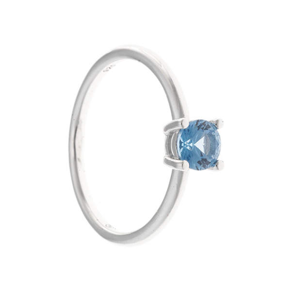 Anillo con circonita azul en plata rodiada primera ley.
