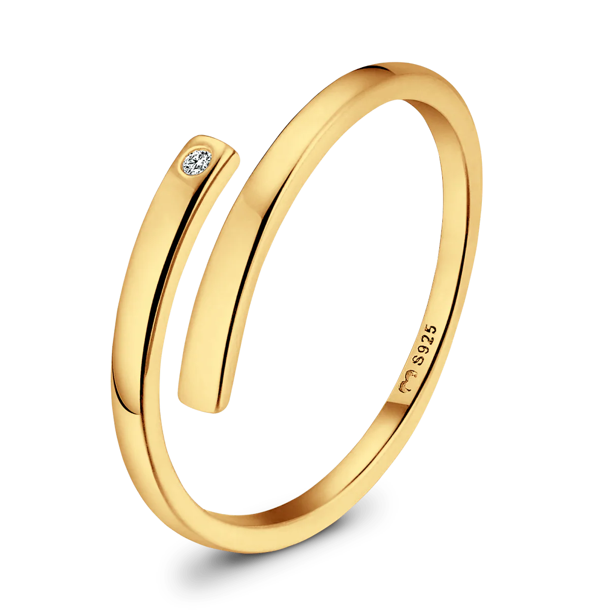 Anillo de aro abierto y las puntas en direcciones opuestas con una circonita brillante decorativa, en plata de primera ley (S925).