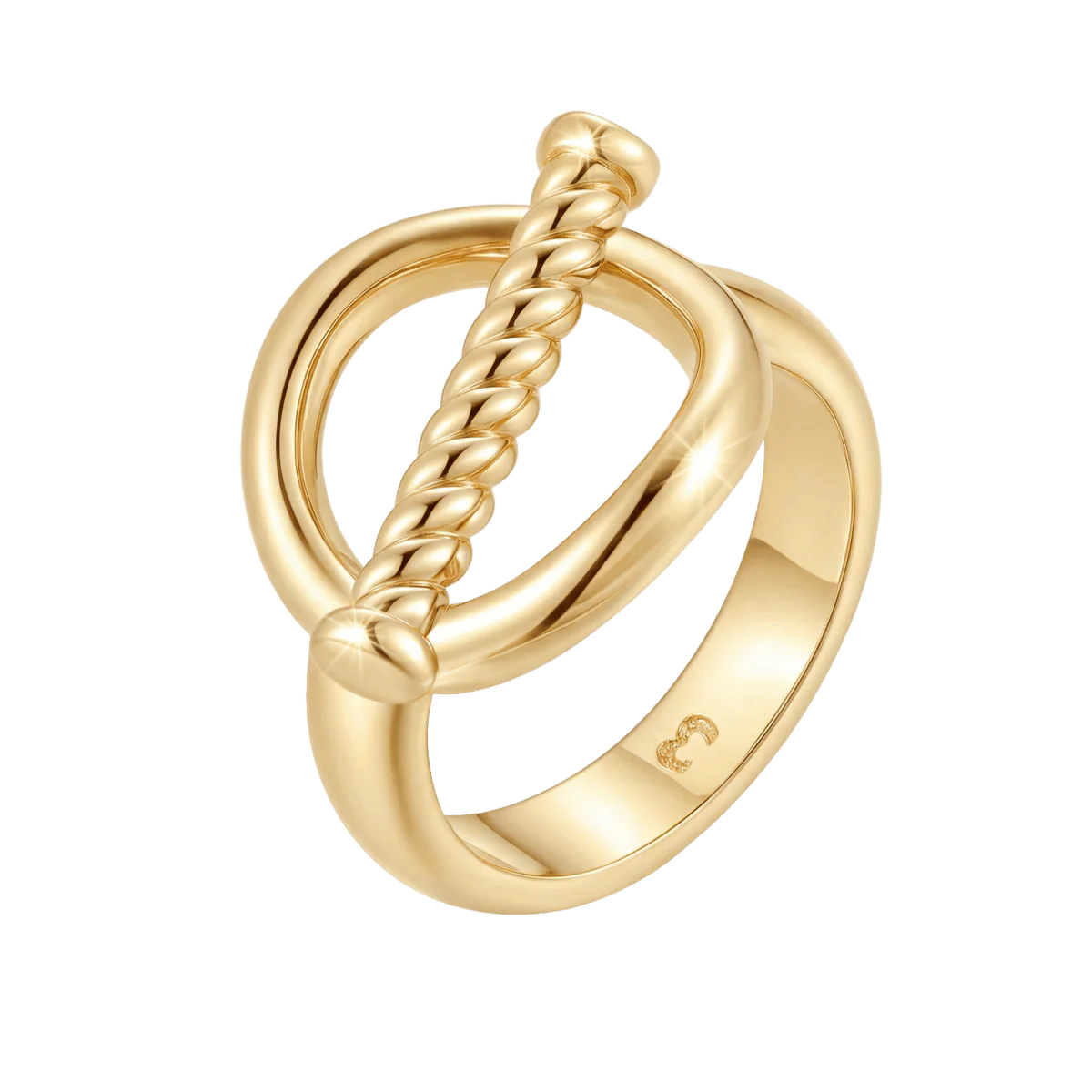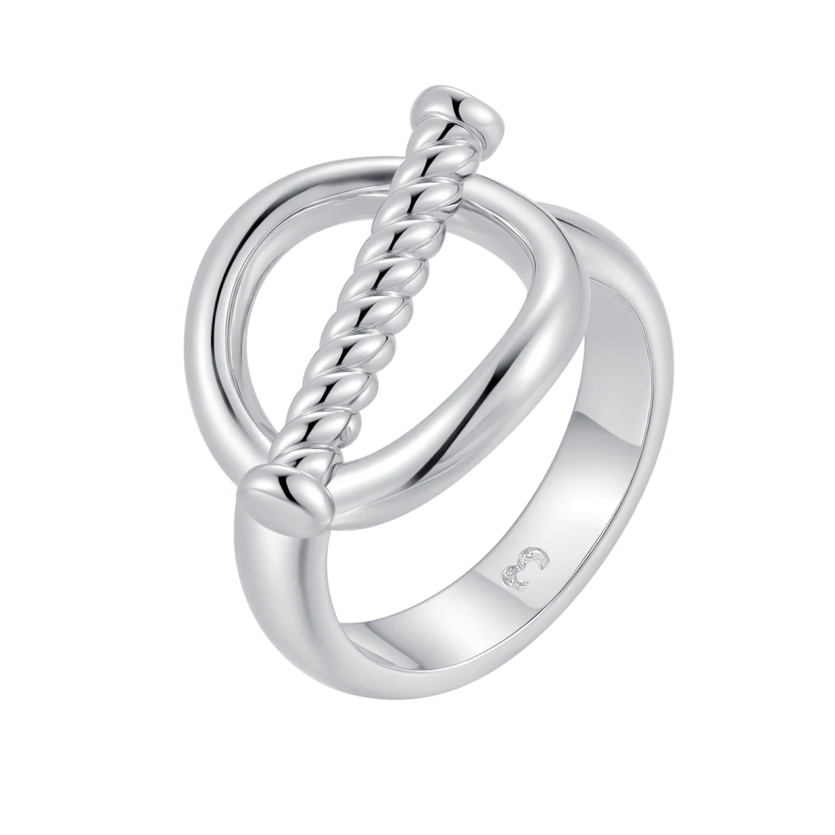 Anillo con un diseño contemporáneo y elegante, su parte superior está formada por una figura ovalada abierta de banda lisa y pulida, atravesada por una barra con textura trenzada con un toque distintivo, elaborado en acero inoxidable de la mejor calidad (316L).