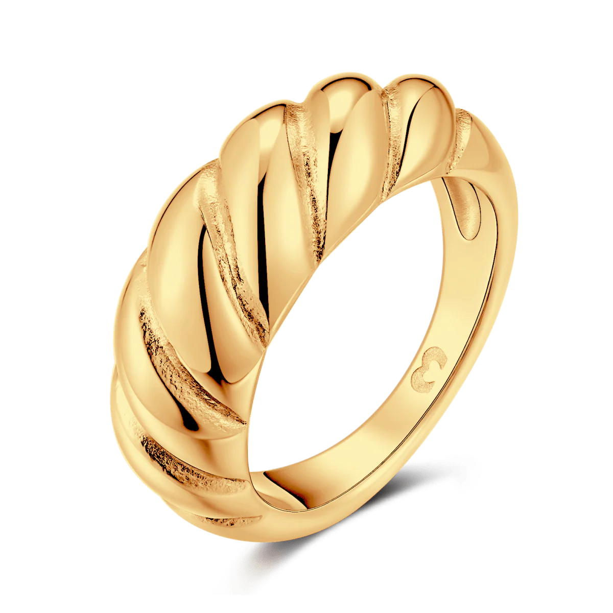 Anillo con diseño trenzado en forma espiral con secciones alternadas entre acabado pulido y acabado mate y texturizado, elaborado en acero inoxidable de la mejor calidad (316L).