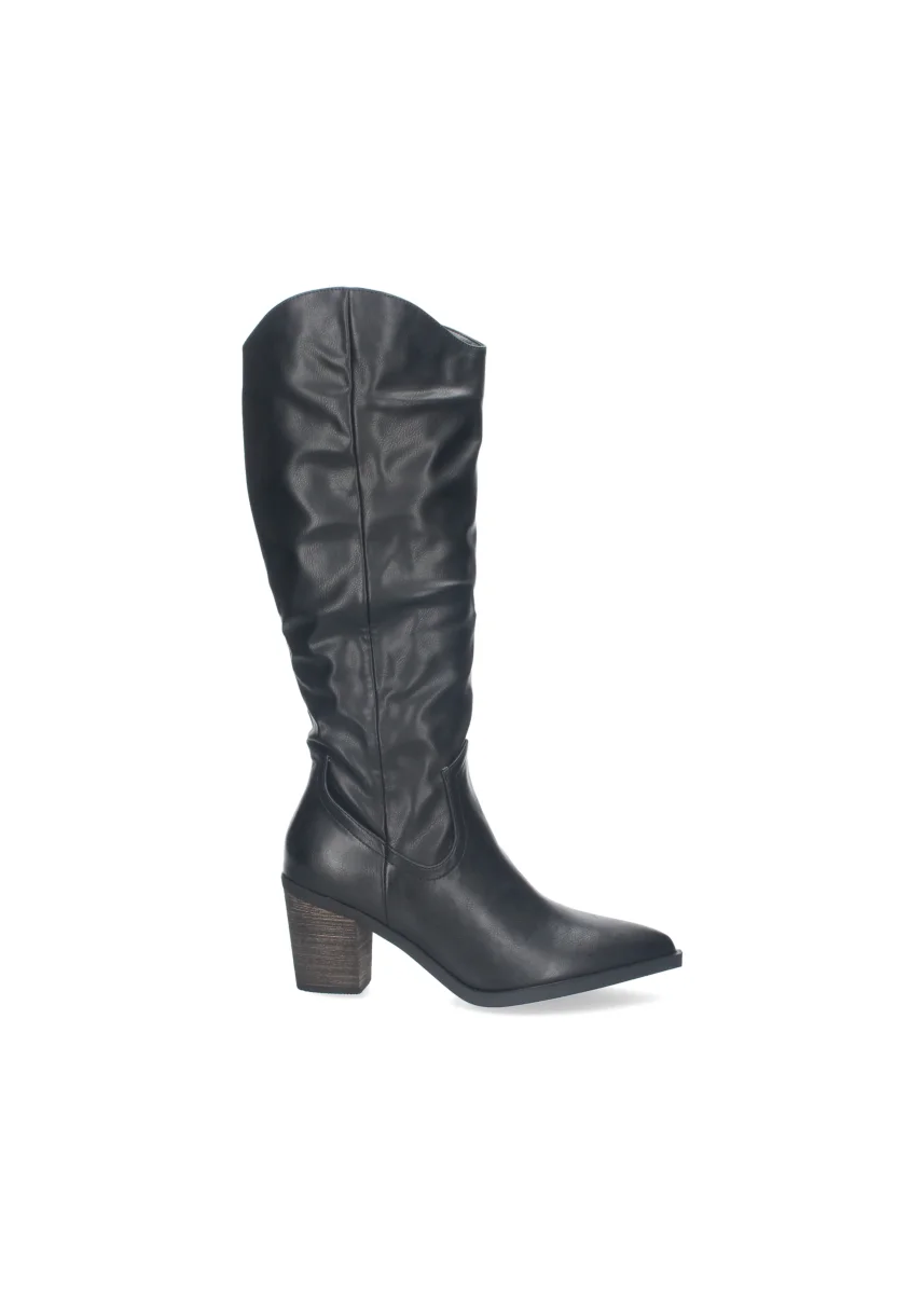 Se destaca una bota campera de lisa polipiel, con caña arrugada y una punta fina que termina con un cierre de cremallera. Altura del Tacón: 7,5cm, Plataforma: 0cm; un diseño llamativo y sofisticado que ofrece una exclusiva experiencia de lujo para cualquier evento.