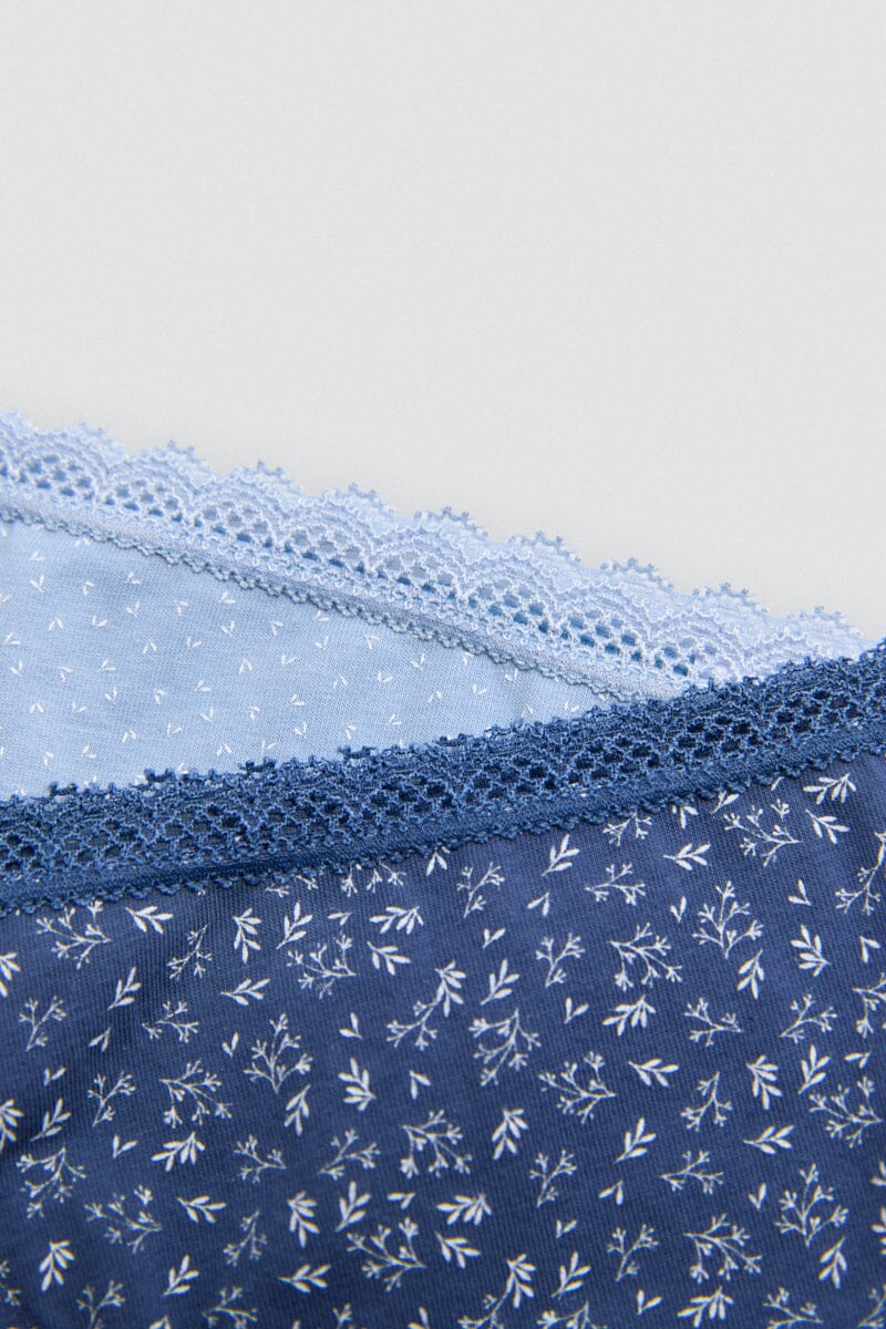 Incluye dos modelos coordinados: una braguita azul marino con estampado floral y otra azul claro con microestampado. Su corte midi aporta una cobertura equilibrada, favorecedora y práctica para llevar a diario.