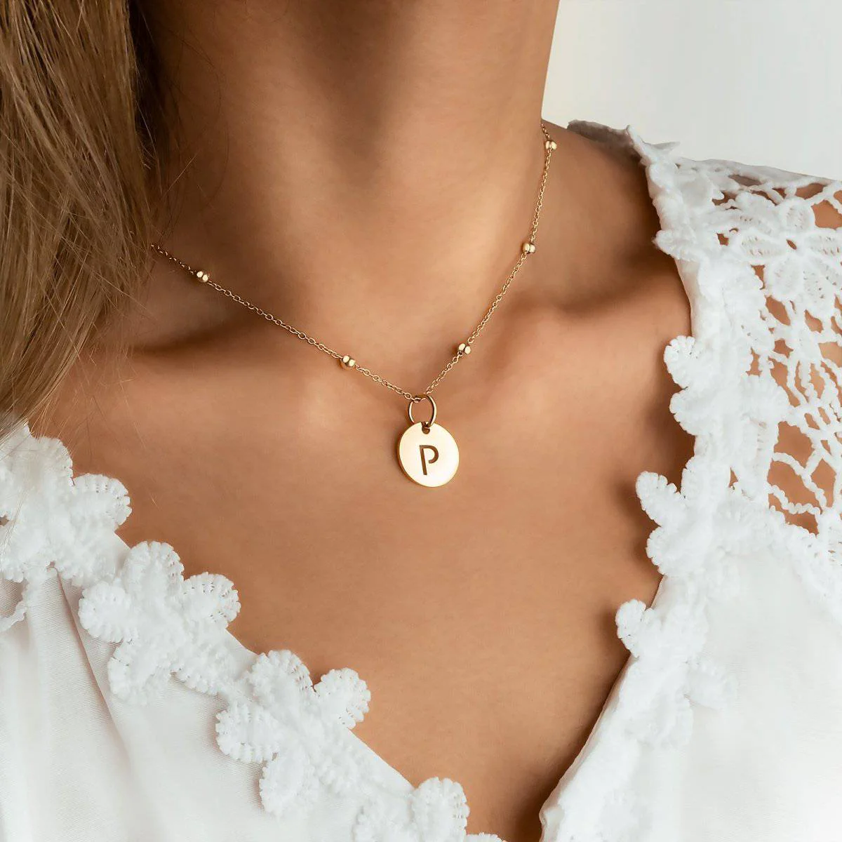 Precioso collar con tu letra inicial encerrada en un círculo plano y pequeñas bolitas alrededor de la cadenita, para escoger la que prefieras, en acero inoxidable de la mejor calidad (316L).