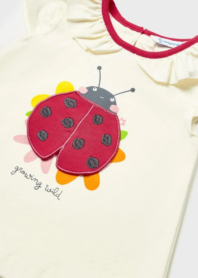 Playera de manga corta para bebé. Cuello redondo. Pequeña abertura en la espalda con cierre de botón para facilitar la puesta de la prenda. Elementos de adorno: dibujos decorativos, holán decorativo