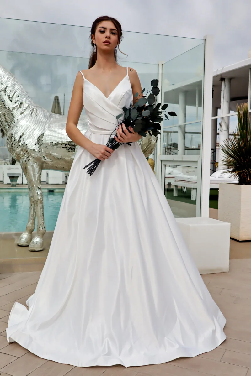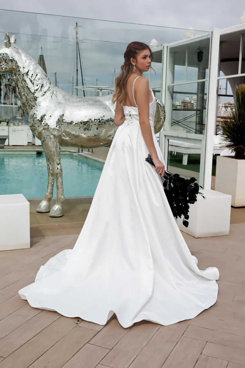 ¡Descubre el vestido de NANTES! Perfecto para lucir con estilo, se destaca por su corte a, cola catedral, tirante fino y lazo desmontable. El pecho está drapeado para darle movimiento y un toque único. ¡Da un paso al frente con NANTES!