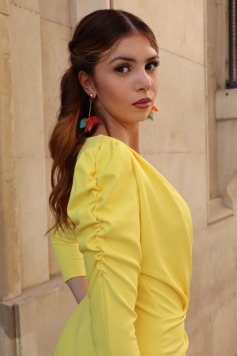 ¡Deslumbra en tu próxima fiesta con PETRE! Este vestido de cóctel en amarillo vibrante y mangas francesas drapeadas te hará sentir elegante y cómoda. Ideal para eventos de día, su color atractivo te destacará en cualquier ocasión. ¡Haz una entrada triunfal con PETRE!