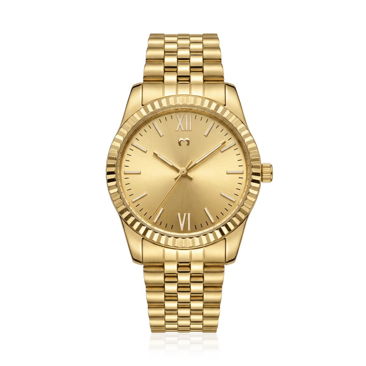 • Esfera: Es de color oro, cuenta con números romanos en las posiciones de las 12 y 6 horas, mientras que el resto de las horas están marcadas con índices lineales en color dorado, las agujas son finas con un segundero del mismo tono y el bisel cuenta con un acabado estriado que rodea la esfera.