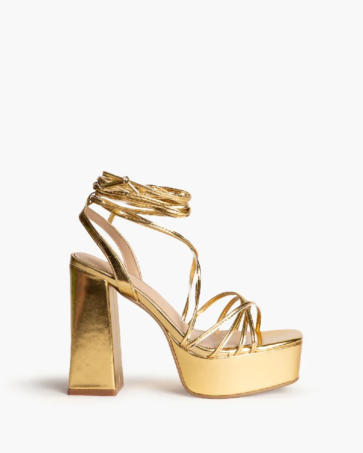 Deslumbra en cada paso con esta sandalia dorada de tacón alto con plataforma, diseñada para realzar tu estilo con un toque sofisticado y glamuroso. Su diseño con tiras finas entrecruzadas y cierre de pulsera al tobillo aporta sujeción y elegancia, mientras que la plataforma delantera asegura mayor comodidad pese a la altura del tacón ancho.