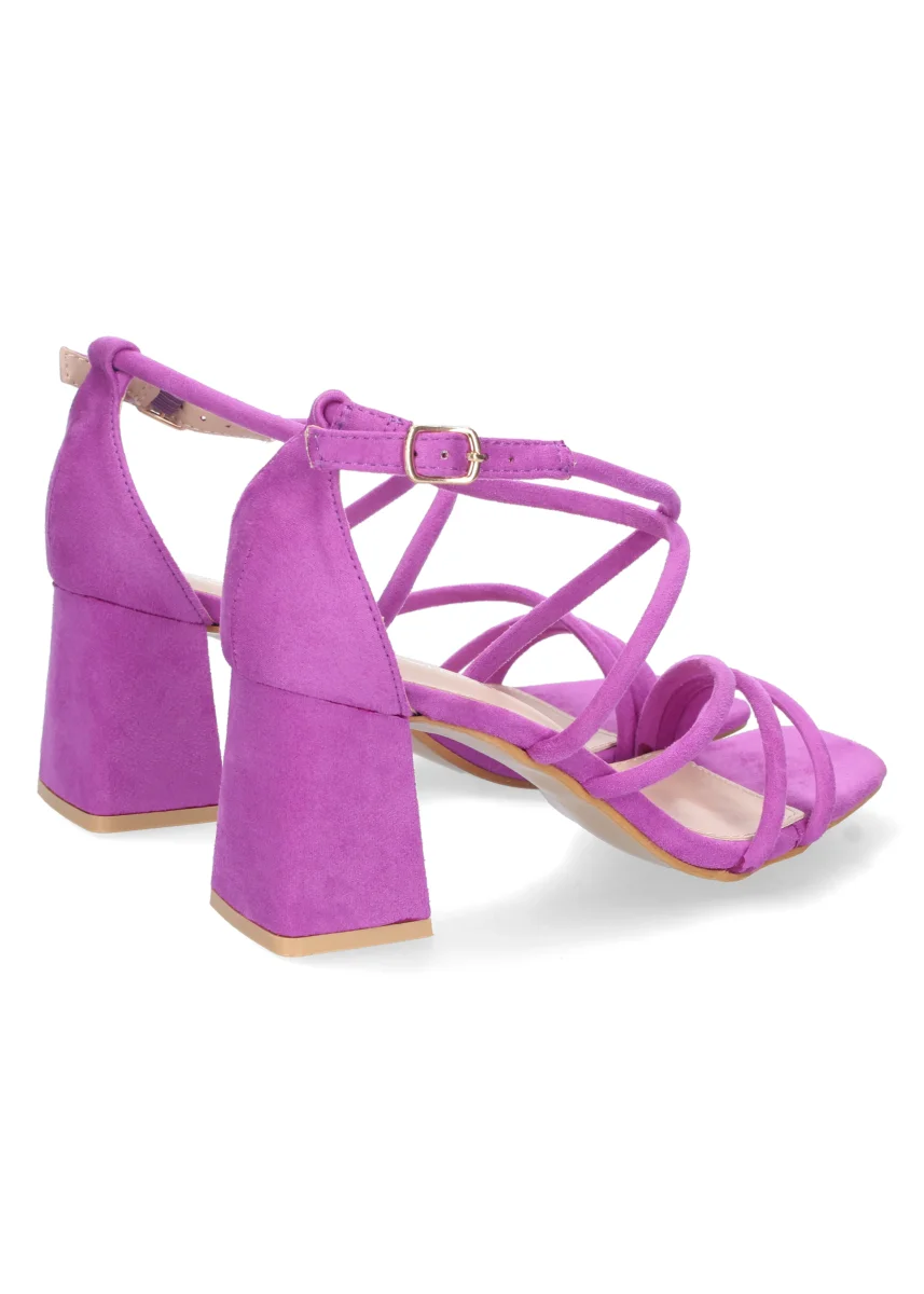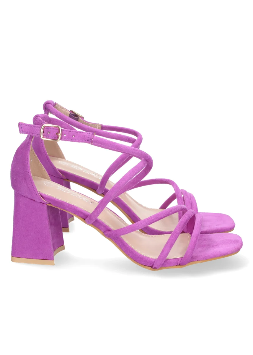 Sandalia de tacón con tiras finas y cruzadas para mujer, cerrada en el talón con hebilla, con un tacón de 7cm y una plataforma de 0cm para una mayor comodidad.