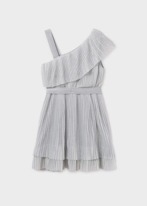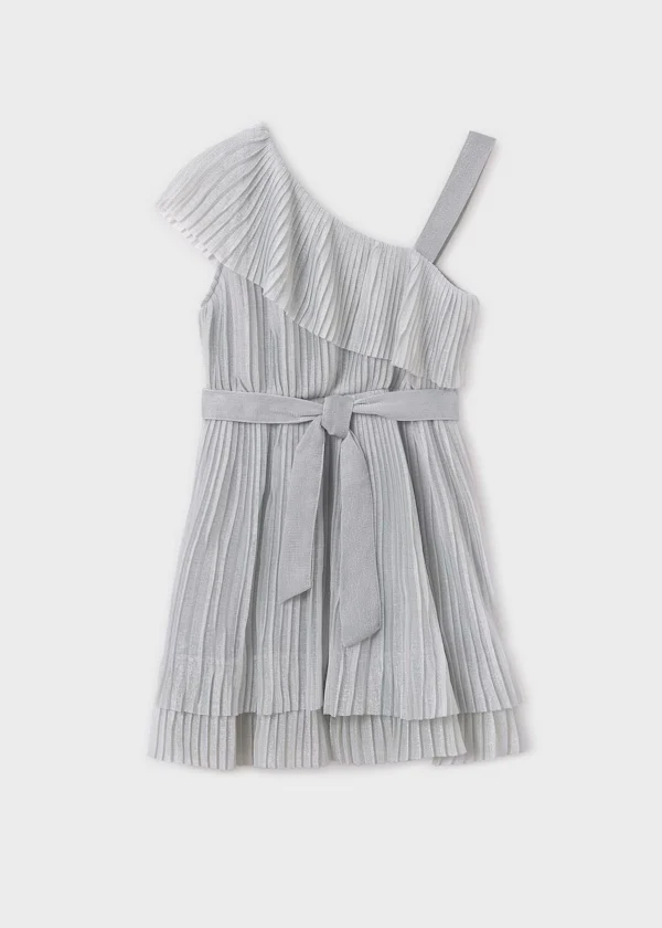 Este vestido plisado asimétrico en color plata es perfecto para una ocasión formal o una fiesta para niñas. Su diseño elegante y único seguramente hará que su hija se destaque. Confeccionado con materiales de alta calidad, este vestido asegura una cómoda y hermosa experiencia para su niña.