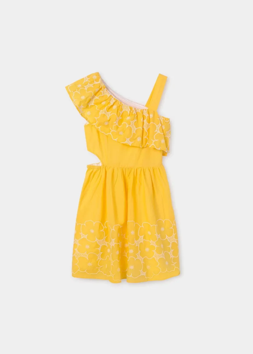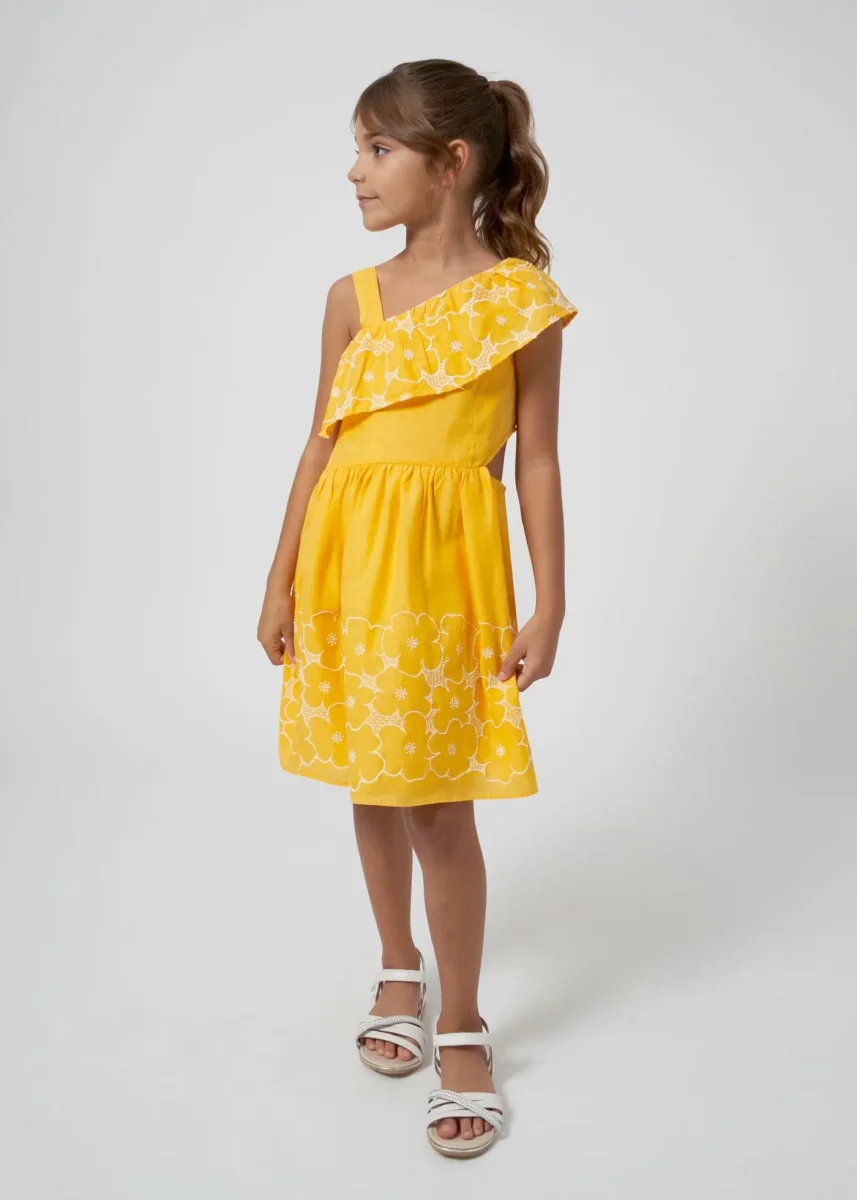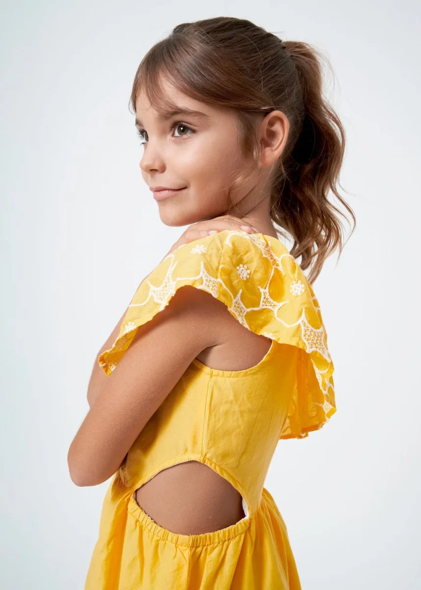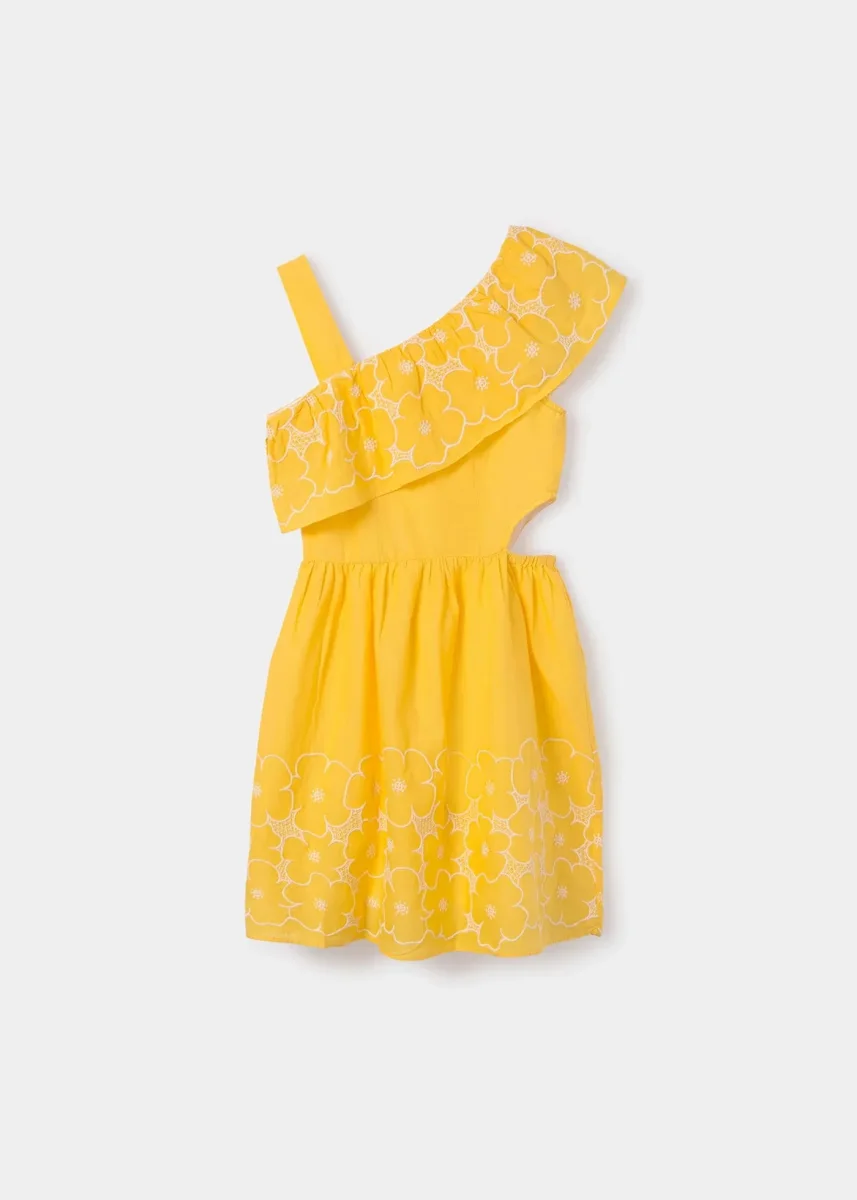 vestido olan en cuello, abertura en cintura color banananiña, mayoral.