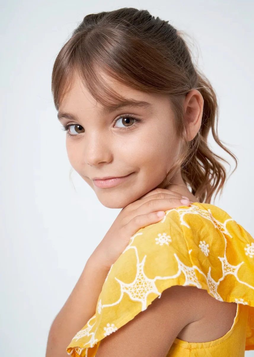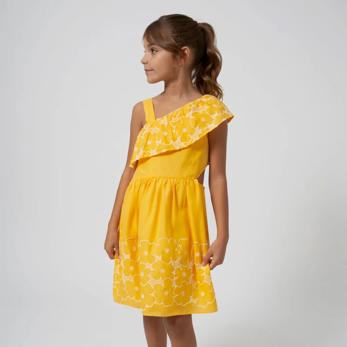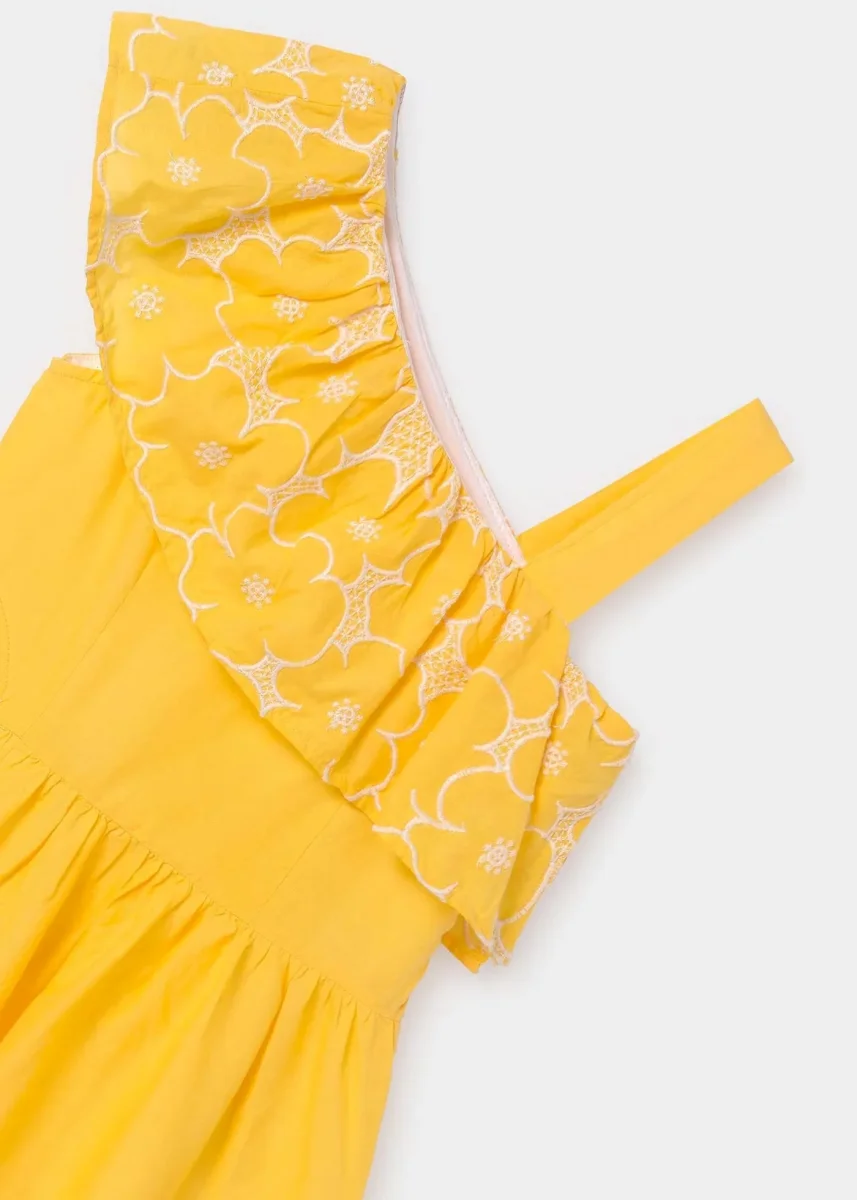 vestido olan en cuello, abertura en cintura color banananiña, mayoral.