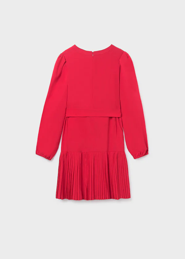 Vestido de manga larga para chica con puños elásticos. Cierre central trasero con cremallera oculta. Confección con tejido de crepé fluido y de caída suave. Suave forro interior de poliéster. Modelo con diseño plisado.