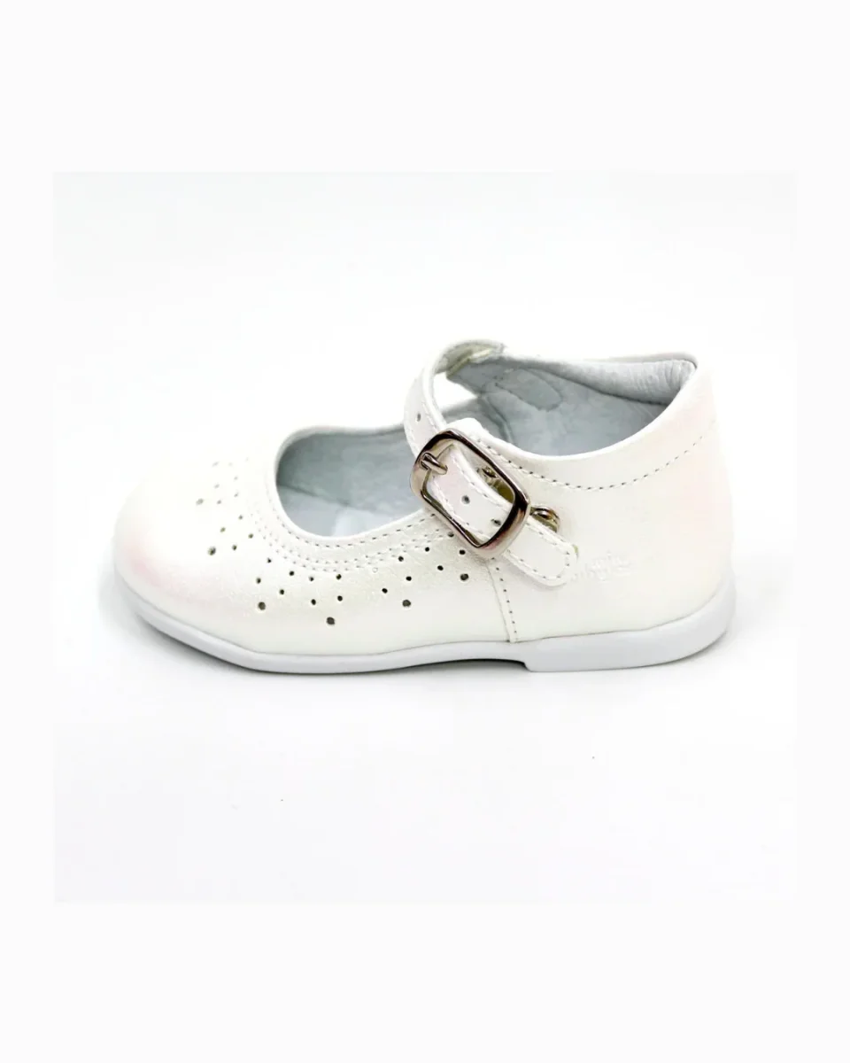 Calzado en tono perla nacarado con detalles perforados y cierre con hebilla dorada, que combina elegancia y sofisticación.